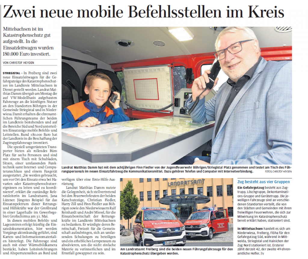 Am 16. Juni war es endlich so weit, vier Kameraden machten sich auf den Weg nach Baden-Württemberg, um unseren neuen ELW1 abzuholen. Gegen 21.30Uhr traf dann das neue Einsatzfahrzeug nach über fünf Stunden Fahrt in Böhrigen ein und wurde das letzte Stück durch unsere anderen Einsatzfahrzeuge begleitet. Der neue ELW ist wie sein Vorgänger, dem „Gefahrgutzug Nord“ des Landkreis Mittelsachsen zugeordnet und wird ebenfalls als Führungsfahrzeug in der Gemeindefeuerwehr Striegistal eingesetzt.